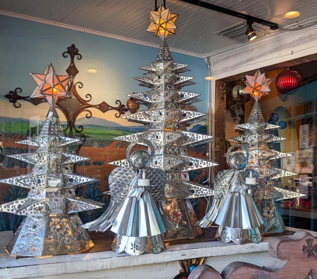 Dunedin is on the west coast of Florida, near Clearwater but a bit less crowded, because it doesn’t have world-class beaches. This stylized and perforated Christmas display is from the window of Casa Tina, a Mexican restaurant.