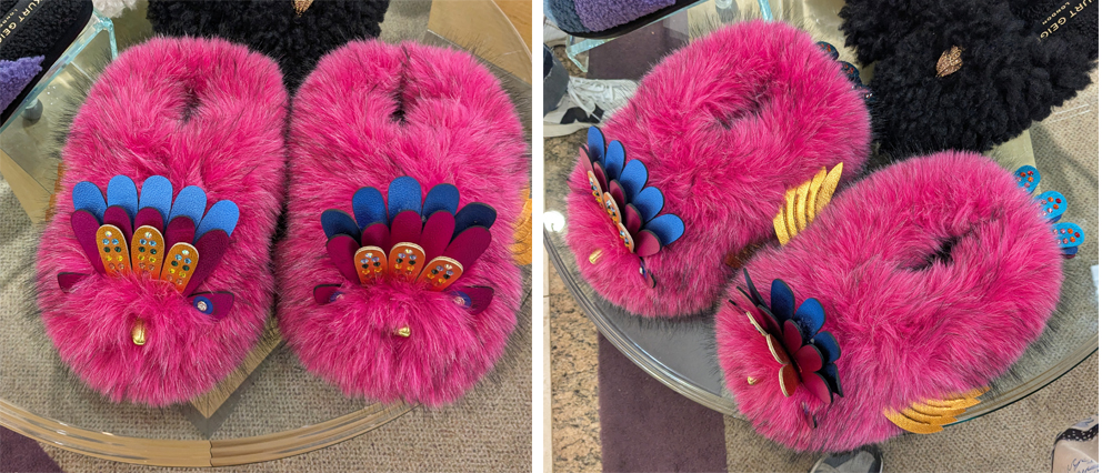 Fortunately I have Grok at hand to tell me: “These are Kurt Geiger London Eagle Fluff Slippers (in fuchsia pink/combination color). The design represents the brand’s iconic eagle motif – Kurt Geiger’s signature symbol. The bright pink faux fur body is paired with multicolored 3D metallic leather cut-outs forming stylized wings and tail feathers, along with crystal embellishments and a small eagle head detail at the front.” Per the company’s website, a mere $98.