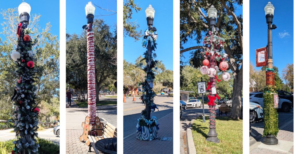 After walking several blocks in Dunedin, I realized that each of the old-fashioned lamp-posts on Main Street was decorated by the nearest business. Here are a few of them. The second is in front of a candy store, the fourth in front of an Asian restaurant, the fifth in front of a wine store.